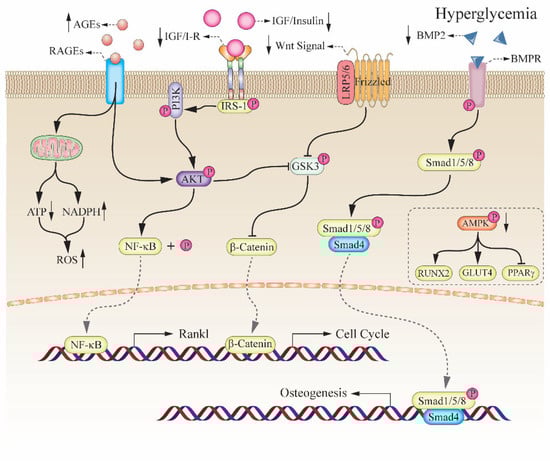 Bone fragility induced by hyperglycemia. High levels of AGEs induced by hyperglycemia resulted in the increase of NADPH and ATP, which lead to high levels of ROS in osteoblastic cells. Insulin deficiency and desensitization of insulin receptors reduced phosphorylation of PI3K through the action of insulin binding its receptor the same as the IGF-1 pathway. Extracellular AGEs binding RAGEs or PI3K stimulate the activation of AKT that thereafter inhibited the phosphorylation of GSK3b that suppresses b-catenin accumulation in the downstream of Wnt signal pathway and dephosphorylates NF-kB that promotes the expression of the RANKL in osteoblast. Furthermore, the downregulation of BMP2 induced by hyperglycemia induces dampened the binding between Smad1/5/8 and Samd4 in the cytoplasm, which blocked that process of osteogenesis. In addition, that the reduced activity of AMPKa under hyperglycemia dismissed the inhibition of PPARg and decreased the expression of RUNX2 and GLUT4, which affected the differentiation of the MSCs into osteoblasts. Refs. [,,,,,,,,].