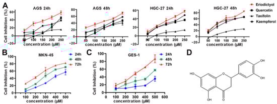 Inhibition of cell viability of gastric cancer (GC) cells by eriodictyol, quercetin, taxifolin, and kaempferol. (A) Cell inhibition by eriodictyol, quercetin, taxifolin, and kaempferol of AGS and HGC-27 cells was determined by CCK-8 assays. (B) Cell inhibition by eriodictyol of MKN-45 cells was determined by CCK-8 assays. (C) Cell inhibition by eriodictyol of GES-1 cells was determined by CCK-8 assays. (D) The chemical structure of eriodictyol. Three independent experiments were performed, and data are presented as mean ± SD.