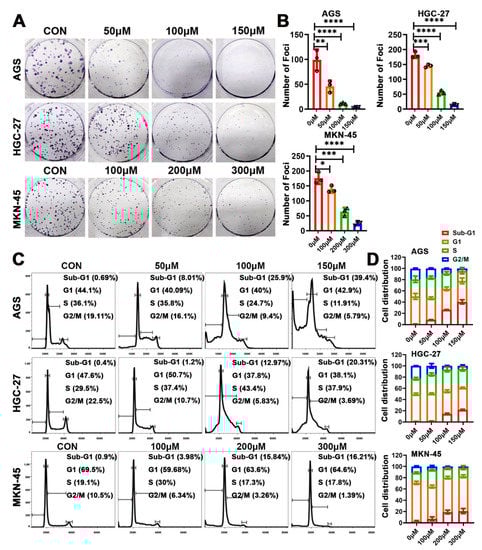 To further examine the inhibitory effects of eriodictyol on proliferation of GC cells, colony formation assays were performed. Eriodictyol treatment significantly reduced the foci numbers as well as sizes in GC cells (Figure 2A,B). The inhibitory effects of eriodictyol on colony formation are dose-dependent in line with those on cell viability. Then, cell cycle analysis was performed, and an obvious increase in cell fractions in the sub-G1 phase was observed, indicating induction of apoptosis (Figure 2C,D). Moreover, there is a gradual decrease in cell population in the G2/M phase with the increase in eriodictyol concentration (Figure 2C,D). Our results suggest the anti-proliferation effects of eriodictyol on GC cells.