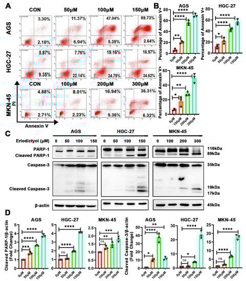 Eriodictyol induces cell apoptosis in GC cells. (A) Cells in early and late apoptotic stages were detected with Annexin V/PI stain and flow cytometry analysis. (B) The quantitative analysis of Annexin V-positive percentages is demonstrated as a histogram. (C) The levels of PARP-1, cleaved PARP-1, Caspase-3, and cleaved Caspase-3 were measured with Western blotting. (D) The relative protein levels of cleaved PARP-1 and cleaved Caspase-3 were quantified and are demonstrated as a histogram. Three independent experiments were performed, and data are presented as mean ± SD. ns: no significance, * p < 0.05, ** p < 0.01, *** p < 0.001, **** p < 0.0001.