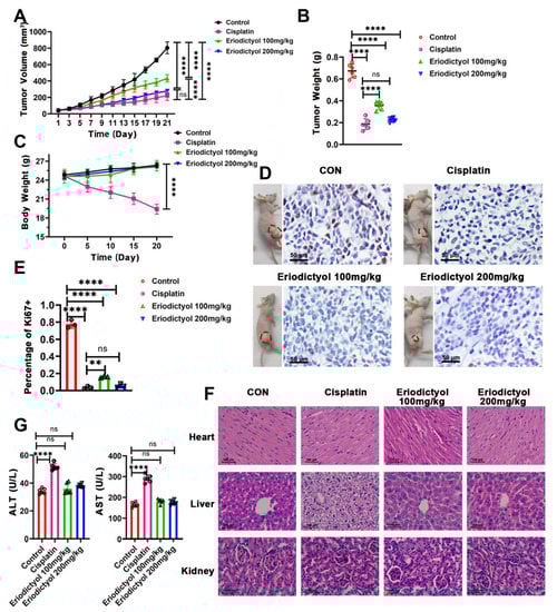 Eriodictyol inhibits tumor growth in vivo. (A–C) The tumor volumes (A), tumor weights (B), and body weights (C) of the mice from control, cisplatin-treated, and eriodictyol-treated groups were measured, and the statistical results are shown (n = 6). (D) The representative images of mice bearing tumors and the Ki-67 staining results of the corresponding tumors are shown. Original magnification, 400×; scale bars, 50 µm. (E) The quantitative analysis of Ki-67-positive percentages is demonstrated as a histogram. (F) H&E staining of major organs from each group. Original magnification, 400×; scale bars, 100 µm. (G) Serum levels of ALT and AST were detected and are statistically illustrated as a histogram (n = 6). Data are presented as mean ± SD. ns: no significance, ** p < 0.01, **** p < 0.0001.