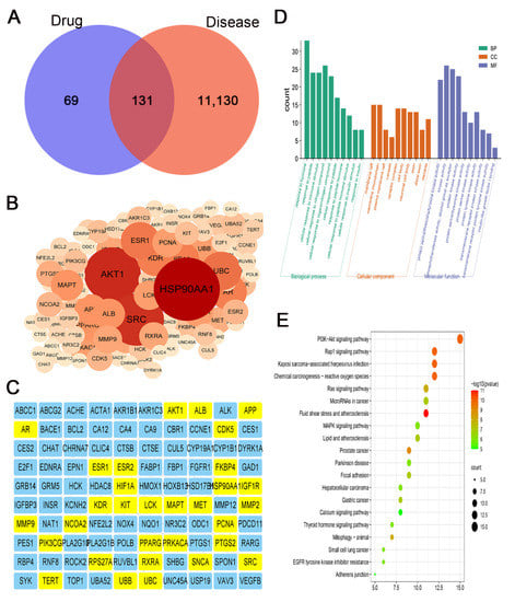 Network pharmacology analysis of the candidate targets of eriodictyol against GC. (A) Venn diagram revealing the overlapping potential targets between eriodictyol treatment and GC. (B) The result of PPI analysis for overlapping potential targets. (C) 100 core targets of eriodictyol acting on GC. (D) The result of GO enrichment analysis for the potential pathways of eriodictyol in GC. (E) The result of KEGG enrichment analysis for the potential pathways of eriodictyol in GC.