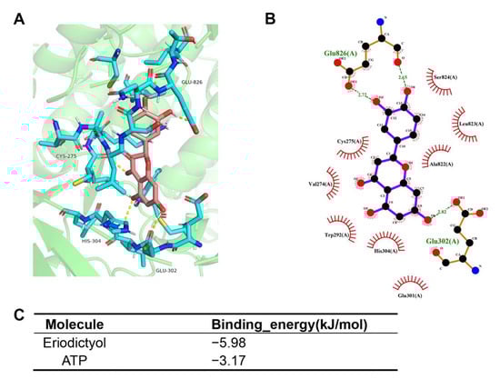 Then, molecular docking was performed to confirm the binding modes of eriodictyol with PIK3CG (PDB ID: 1E8X). The results revealed that eriodictyol was docked in a similar position to ATP. As shown in Figure 6A,B, eriodictyol formed five hydrogen bonds with CYS-275, GLU-302, HIS-304, and GLU-826 in PIK3CG. In addition, the binding energy was calculated to evaluate the degree of complementarity between the component (eriodictyol or ATP) and the PIK3CG protein. The binding energies between eriodictyol and PIK3CG and between ATP and PIK3CG were −5.98 and −3.17 kJ/mol, respectively (Figure 6C). As the binding energy between eriodictyol and PIK3CG was lower than that between ATP and PIK3CG, our results indicate a more stable conformation between eriodictyol and PIK3CG. These suggest that eriodictyol could compete with ATP, bind to the active sites of PIK3CG, and thus inhibit the activity of PI3K kinase.
