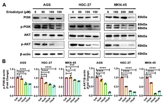 Eriodictyol inhibits GC through the PI3K/AKT pathway. (A) The protein levels of PI3K, phosphorylated PI3K, AKT, and phosphorylated AKT were measured with Western blotting. (B) The relative protein levels of phosphorylated PI3K and phosphorylated AKT were quantified and are demonstrated as a histogram. Three independent experiments were performed, and data are presented as mean ± SD. ns: no significance, * p < 0.05, ** p < 0.01, *** p < 0.001, **** p < 0.0001.