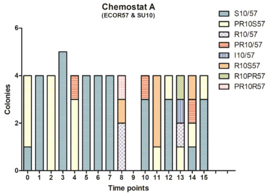 ECOR57 bacteria were inoculated into the chemostats and was left to grow for 24 h in a 37 °C water bath until they reached steady state. Phages SU10 and/or SU57 were added at different time points and different MOIs in order to investigate changes in population dynamics between phages and bacteria. Five hundred microliter aliquots of the phage(s)–bacteria mixture were removed at 16 specific time points (T = 0, 0.5, 1, 1.5, 2, 3, 4, 6, 24, 25, 26, 28, 30, 47, 53, and 72.5 h) for quantification and characterization (as described below). Throughout experimentation, the following conditions were kept: Chemostat A contained ECOR57 and SU10, Chemostat B contained ECOR57 and SU57, Chemostat C contained ECOR57 which was first infected with SU10 and then with SU57, and Chemostat D contained ECOR57 which was first infected by SU57 and then by SU10. The MOIs tested for SU10 were 0.33, 0.42, 0.43, 0.50, 0.55, 0.65, 0.83, 1.00, 1.10, 1.50, 2.30, and 1300. The MOIs tested for SU57 were 0.13, 0.12, 0.16, 1.04, 1.14, 1.20, 3.40, 3.60, 4.50, 10.4, 25.9, and 46.9. ECOR57 bacteria were quantified using the drop count methodology [85]. SU10 and SU57 phage titers were determined using the previously described methodology. The following indicator bacterial strains were used to determine the phage titers: in chemostats A, C, and D: ECOR10 to measure phage SU10 as it is permissive to SU10 and refractory to SU57; chemostat B: ECOR57 to measure phage SU57. ECOR63 bacteria was used to titer phage SU57 in chemostats where multiple infections were occurring (i.e., chemostats C and D) as it is permissive to SU57 and refractory to SU10. The experimental duration for each chemostat run was 72.5 h. Chemostat experiments were performed four times (see Supplementary Materials Figure S1 for the additional three experiments).