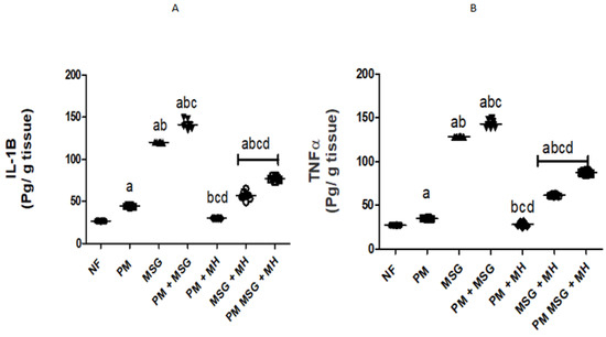 2.3. MH Reestablishes Inflammatory Biomarkers in PM and/or MSG—Fed Rat Pups