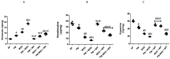 2.4. MH Balances Monoamines Neurotransmittors of PM and/or MSG—Fed Rat Pups