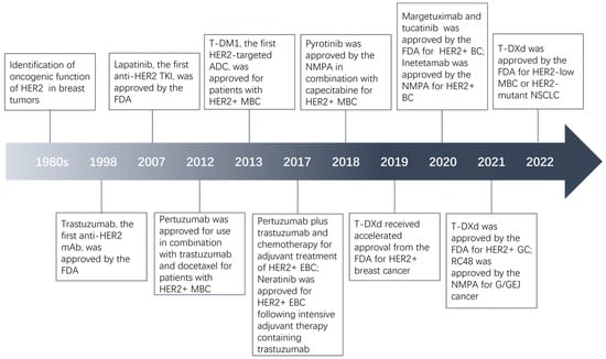 HER2 overexpression/amplification was found in many human malignant tumors, accounting for about 20% of breast and gastric cancer, 16% of epithelial ovarian cancer, and 1.3% of colorectal cancer [,,,,]. In the 1980s, it was demonstrated to be a significant predictor of breast cancer []. Subsequently, this phenomenon was found in lung, ovarian, and gastric cancer [,,]. Currently, HER2 has emerged as an important biomarker in the management of tumors, especially in breast cancer. The first monoclonal antibody (mAb) targeting HER2, trastuzumab, received approval from the Food and Drug Administration (FDA) back in 1998. It was approved for use as a monotherapy or in combination with paclitaxel to treat HER2-positive metastatic breast cancer (MBC) []. In 2007, lapatinib, the first anti-HER2 tyrosine kinase inhibitor (TKI), was used in patients with HER2-positive MBC in combination with capecitabine []. Since then, many HER2-targeted mAbs such as pertuzumab and margetuximab, and TKIs like neratinib and pyrotinib have been developed successfully and introduced into the clinic. Trastuzumab emtansine (T-DM1) belongs to antibody-drug conjugate (ADC), a class of drugs with a complex structure and special effects. In 2013, T-DM1, the first HER2-targeted ADC, was approved as a single agent by the FDA for patients with HER2-positive MBC who had been treated with trastuzumab and a taxane [,]. In 2019, another ADC, trastuzumab deruxtecan (T-DXd), was used for patients with HER2-positive breast cancer who had previously received HER2-targeted therapy []. Given the remarkable efficacy observed with trastuzumab and other medications in breast cancer, some HER2 inhibitors have been investigated for other tumors. For example, T-DXd received subsequent approvals for HER2-positive gastric cancer in 2021 and HER2-mutant non-small cell lung cancer (NSCLC) in 2022 [,]. Herein, we review the development of HER2 inhibitors in a variety of tumors over the past 20 years and focus on ADCs. Figure 1 shows the major milestones of HER2 inhibitors.