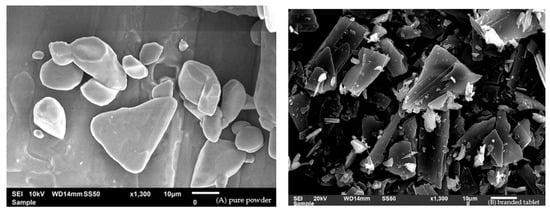 The main morphological features of pure MET powder, the branded MET product, and the generic MET product are presented in Figure 7. The particle size was the smallest for the generic MET product, followed by the branded MET product and then pure MET powder. The distance between particles in the generic MET product was the shortest in comparison to the two other samples. The SEM images of the three samples showed a coarse surface for the particles of the generic MET product, with some cracks and stretches, while a smooth surface was observed for the branded MET product and pure MET powder.