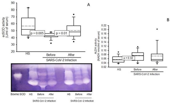 Activities of the ecSOD (A) and ALDH (B) in the HS and the patients infected by SARS-CoV-2 before and after the NAC treatment. In the panel, a representative gel of ecSOD activity is presented on a native 10% polyacrylamide gel. In the first lane, the activity of the commercial enzyme (bovine SOD-2) is observed, which is necessary to quantify the activity of the enzyme. The results are shown in plot boxes and whiskers in percentiles 75, 25, the median and the bridged midline, as well as outliers, since the sample size is small and is not normally distributed. Abbreviations: ecSOD; extra cellular super oxide dismutase, ALDH; aldehyde deshydrogenase, HS; healthy subjects, NAC; N-acetyl cysteine.