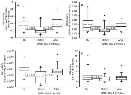 Activities of the GPx (A), TrxR (B), GST (C), and GR (D) in COVID-19 patients with the NAC treatment. The results are shown in plot boxes and whiskers in percentiles 75, 25, the median and the bridged midline, as well as outliers, since the sample size is small and is not normally distributed. Abbreviations: GPx = glutathione peroxidase, TrxR = thioredoxin reductase, GST = glutathione-S-transferase, GR = glutathione reductase, HS; healthy subjects, NAC; N-acetyl cysteine.
