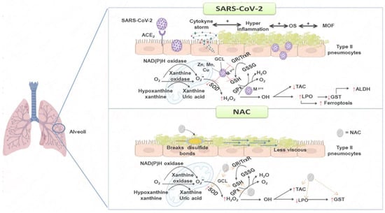 In the same sense, the other enzymes that participate in the S-glutathionylation process showed a decrease in their activity in this study, including GST. GST is a superfamily of isoenzymes that includes the α, μ, π, ω, θ, δ, ς, σ, κ, and m isoforms. These enzymes are multifunctional and are found in plasma, cell membranes, cytoplasm, endoplasmic reticulum, mitochondria, and the nucleus []. They participate as protective enzymes for exogenous and endogenous cellular detoxification and neutralization of the xenobiotics, oxidized lipids, ROS, and they decrease the rate of LPO through GSH conjugation. This conjugation increases the solubility of the toxic products, facilitating their excretion from the cell. They also play an important role in idiopathic pulmonary fibrosis and lung fibro genesis []. Several studies have reported that SARS-CoV-2 decrease the activity of these enzymes []. A study in patients with COVID-19 ranging in age from 20 to 58 years showed a decrease in the GSTp1 and there was a correlation with a higher prevalence of deaths in males in comparison with female patients []. Another study showed that the frequency of GSTM1−/−, GSTT1−/−, and GSTM1−/−/GSTT1−/− was higher in severe COVID-19. In patients with both GSTM1 + /+ and GSTT1−/− genotypes there was a poor survival rate. Therefore, patients with COVID-19 having the GSTT1−/− genotype had a high mortality rate []. However, the treatment with NAC favored an increase in this enzyme in the present study. This effect may be attributed to the increase in the GSH concentration by the treatment because it is a substrate for this enzyme, resulting in a decreased LPO. Nevertheless, the decrease in the activity of this enzyme could favor the accumulation of the LPO products such as 4-hydroxy-2-transnonenal (4-HNE) or malondialdehyde. LPO is the result of the chain reaction of OH– on the unsaturated fatty acid and it is increased in the presence of transition metals such as Fe. The COVID-19 patients develop ferroptosis due to hijacking of the function of mitochondria and the knockdown of the GPx 4 isoform by the virus []. Furthermore, the peroxidized lipids damage the cell membrane.