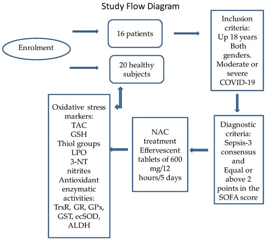 This was an open, prospective, analytical, and longitudinal study (before-after treatment) in 16 patients with COVID-19 who received NAC and the results were compared with those obtained in 20 healthy subjects that acted as a control group. Inclusion criteria: The patients with COVID-19 were 18 years old or more and were admitted to the ICU of the CITIBANAMEX Center and developed or not septic shock, secondary to moderate or severe pneumonia by COVID-19. The treatment was applied between August and September of 2020. Ethical approval was obtained by the local ethics committee on 19th August 2020 (Control-9867/2020, register REG. CONBIOETICA-09-CEI-011–20160627). The protocol was registered (TRIAL REGISTRATION: ClinicalTrials.gov Identifier: NCT 04570254). Diagnostic criteria for septic shock were based in the Sepsis-3 consensus []. A written informed consent for enrollment or consent to use patient data was obtained from each patient or their legal surrogate, in accordance with the Helsinki declaration, as amended by the congress of Tokyo, Japan []. Patients considered to have septic shock had to have an acute increase of at least 2 points in the SOFA score [], lactate levels ≥2 mmol/L, and they had to be dependent on a vasopressor for at least 2 h before the time of enrollment. To evaluate organ dysfunction, the SOFA score (neurologic, respiratory, hemodynamic, hepatic, and hematologic) was calculated at admission and during all of the days of treatment []. The hospitalized patients were classified as moderate or severe; this classification was decided according to their ventilatory status. Patients with the severe condition required invasive mechanical intubation according to the Berlin criteria for ARDS []. Exclusion criteria were: patients that were under chronic use (last 6 months) or recent use of steroids, statins, antioxidants, and NAC; patients younger than 18 years; patients that were not able to grant an informed consent, refused to be included; and also pregnant woman or breastfeeding. Figure 4 describes the study flow diagram.