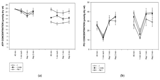 The concentrations of ATP, phosphocreatine, and inorganic phosphate, and the pH value obtained from the 31P NMR spectra, were used to calculate the free AMP concentration. During 1 min ischemia at 40 min, the free AMP concentration (Figure 5a) increased to 8–11 μM. This increase was reduced to the same extent (4 and 5 μM, respectively) in Groups I and I-Ado during 1 min ischemia at 85 min, while it was maintained at 9 μM in Group No I.