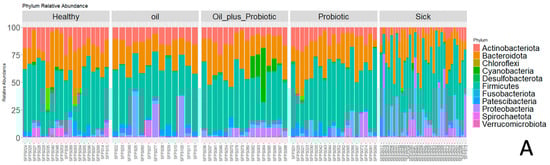 In contrast, the microbial diversity was reduced in the sick rats (Figure 1). According to the statistical comparison of Shannon from the alpha diversity index (Figure 1f), a statistically significant difference was found between healthy rats and rats treated with the probiotic mix plus oil mix protocol and between sick rats and rats treated with the probiotic mix plus oil mix protocol (respectively p value 0026, 0.0002). In the same index, a statistically significant difference was found between the rats to which only the probiotic mix protocol was applied and the rats to which the oil mix + probiotic mix protocol was applied, and between the rats to which only the oil mix protocol was applied and the rats to which the oil mix + probiotic mix protocol was applied (p values are 0.0016 and 0.014, respectively).