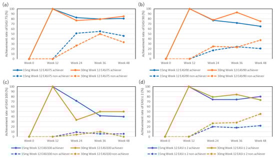 The achievement rate for EASI 75 in week 12 non-achievers increased at later stages: 51.2%, 55.2%, and 46.2% in the 15 mg group and 26.7%, 50%, and 33.3% in the 30 mg group at weeks 24, 36, and 48, respectively, although there were no statistically significant differences in the achievement rates compared to week 12 (0%).