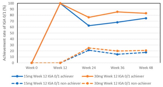 The achievement rates for IGA0/1 in week 12 achievers in the 15 mg group slightly decreased at later stages, although without statistically significant differences compared to week 12 (100%): 62.5%, 68.2%, and 75% at weeks 24, 36, and 48, respectively (Figure 2). The achievement rates for IGA0/1 in week 12 achievers in the 30 mg group were mostly maintained: 76.5%, 85.7%, and 83.3% at weeks 24, 36, and 48, respectively.