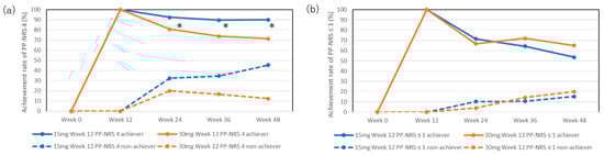 Achievement rates for PP-NRS 4 (a) or PP-NRS ≤ 1 (b) in week 12 achievers or non-achievers during treatment with upadacitinib (15 mg or 30 mg daily). * p < 0.05, week 12 achievers of PP-NRS 4 in the 15 mg group versus those in the 30 mg group, analyzed using Fisher’s exact test.