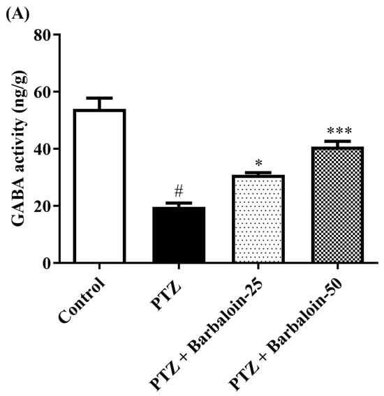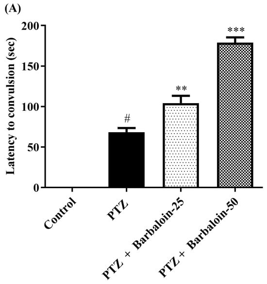 (A–C) Outcome of barbaloin on kindling score. Mean ± S.E.M (n = 6). One-way ANOVA followed by Tukey’s post hoc test (n = 6). # p < 0.001 vs. control, ** p < 0.001, *** p < 0.0001 vs. PTZ.