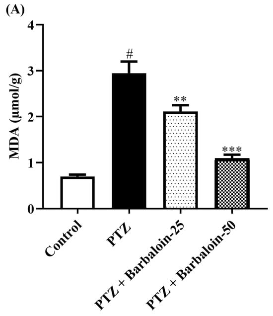 (A–C) The effect of barbaloin on MDA, NO, and AChE levels. Mean ± S.E.M. One-way ANOVA followed by Tukey’s post hoc test (n = 6). # p < 0.001 vs. control, ** p < 0.001, *** p < 0.0001 vs. PTZ.