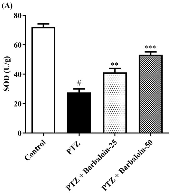 (A–C) The effect of barbaloin on SOD, GSH, and CAT levels. Mean ± S.E.M. One-way ANOVA followed by Tukey’s post hoc test (n = 6). # p < 0.001 vs. control, * p < 0.05, ** p < 0.001, *** p < 0.0001 vs. PTZ.
