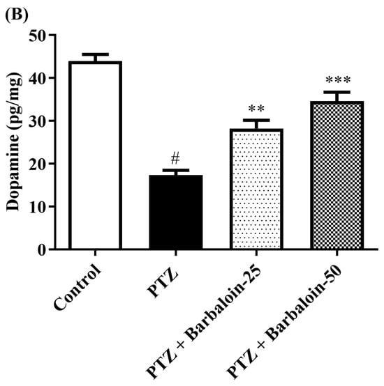 Seizure activity is linked to a diverse array of localized metabolic alterations that impact different neurotransmitters, including monoamines and amino acids [46]. The present investigation revealed that PTZ led to a decline in GABA, NE, DA, and 5-HT concentration in the hippocampal area. These findings align with the earlier investigations conducted by Visweswari et al. (2010) [47,48,49]. Monoamines are crucial in the epileptogenesis process, which involves the formation and advancement of epilepsy. An observed decrease in 5-HT level was shown to be linked to a decline in its synaptosomal absorption, the tryptophan hydroxylase activity inhibition, and a decline in tryptophan concentration in the epilepsy model [50,51]. Conversely, the reduction in DA levels observed in individuals with epilepsy can be linked to the heightened activity of monoamine oxidase and the diminished reuptake process [52]. In addition, NE functions as a neuromodulator with anticonvulsant properties. The reduction in NE levels in individuals with epilepsy is attributed to the decrease in the density of α1 receptors in the brain. This drop may possibly be attributed to the decline in the activity of dopamine-β-hydroxylase (DBH), which is the enzyme that limits the rate of norepinephrine production [53]. During the present research, it was shown that treatment with barbaloin effectively reversed the changes in levels of DA, NE, 5-HT, and GABA.