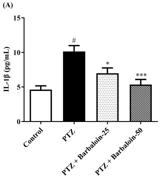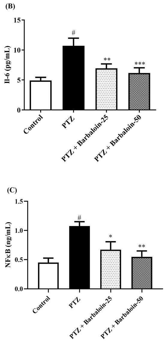 (A–D) The effect of barbaloin on IL-1β, IL-6, NF-κB, and TNF-α levels. Mean ± S.E.M. One-way ANOVA followed by Tukey’s post hoc test (n = 6). # p < 0.001 vs. control, * p < 0.05, ** p < 0.001, *** p < 0.0001 vs. PTZ.