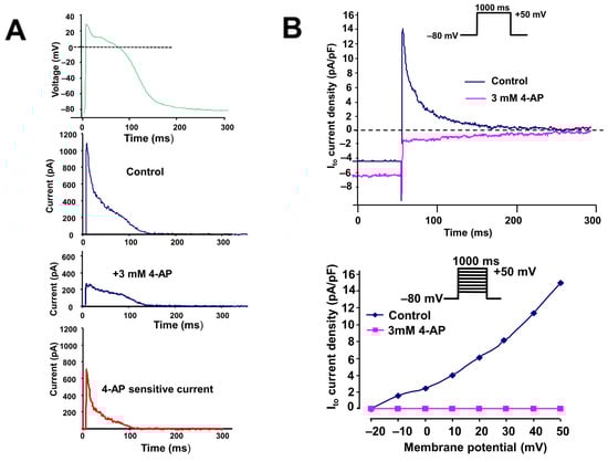 (A) Identification of a 3 mM 4-aminopyridine (4-AP)-sensitive transient outward potassium current (Ito) using an action potential-like voltage pulse in an isolated dog (in SR) right atrial myocyte. The upper panel indicates the applied voltage pulse. (B) Original transient outward potassium current traces activated by rectangular voltages before and after application of 3 µM 4-AP and rectangle voltage pulse in an isolated dog (in SR) right atrial myocyte (top), and the corresponding current–voltage (I–V) relationship (bottom).
