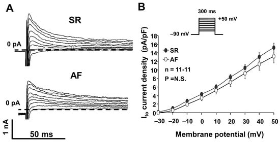 (A) Original transient outward potassium (Ito) current registered in atrial myocytes isolated from dogs in sinus rhythm (SR) and atrial fibrillation (AF). The current was activated at a pulse frequency of 0.33 Hz by rectangular-shaped depolarizing voltage pulses of a 300 ms duration, ranging from −20 mV to 50 mV. (B) Ito current–voltage (I–V) characteristics in atrial cells isolated from SR and AF dogs (n = 11-11, p = N.S.).
