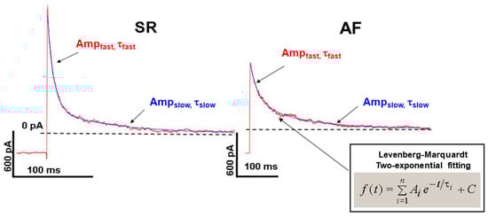 Kinetics of Ito current inactivation in isolated SR and AF canine atrial myocardial cells fitted with double exponential Levenberg–Marquardt equation.