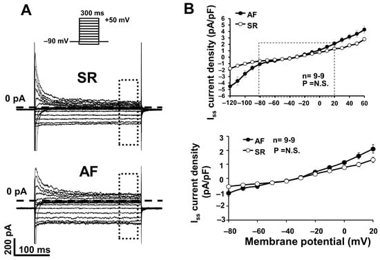 (A) Original inward rectifier potassium (IK1) current recordings in atrial myocytes isolated from dogs in sinus rhythm (SR) and atrial fibrillation (AF). IK1 current was measured as steady state current (Iss). (B) IK1 current–voltage (I–V) characteristics in atrial cells from dogs in SR and AF (n = 9-9; p = N.S.).
