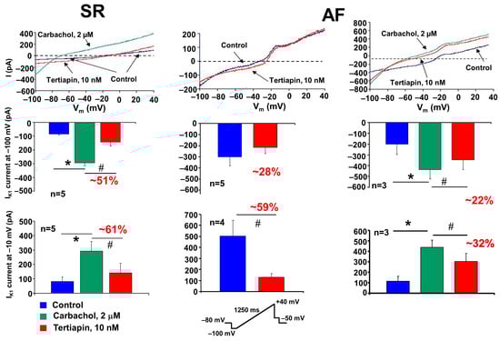 Acetylcholine-sensitive potassium (IK,Ach) currents in atrial myocytes isolated from dogs in sinus rhythm (SR) and atrial fibrillation (AF). The IK,ACh current was activated by the cholinergic agonist carbachol (2 µM) using a ramp voltage protocol from −100 mV to 40 mV from the HP of −80 mV. The carbachol-induced IK,ACh current was blocked with tertiapin (10 nM). Bar graphs represent the amplitude of IK,ACh currents measured at −100 mV (inward range, middle row) and −10 mV (outward range, bottom row). The ramp protocol used is inset at the bottom of the figure. * denotes the statistical significance for carbachol measurements (between blue and green bars), while # denotes the statistical significance for tertiapin measurements (between blue and red bars or green and red bars, respectively).