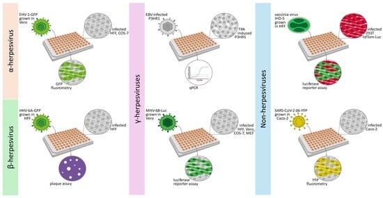 | Virus strain/reporter | equine herpesvirus EHV-1-GFP | human herpesvirus 6 HHV-6A-GFP | Epstein–Barr virus P3HR-1 | murine herpesvirus 68 MHV-68-Luc | vaccinia virus VV IHD-5 | SARS-CoV-2 d6-YFP |