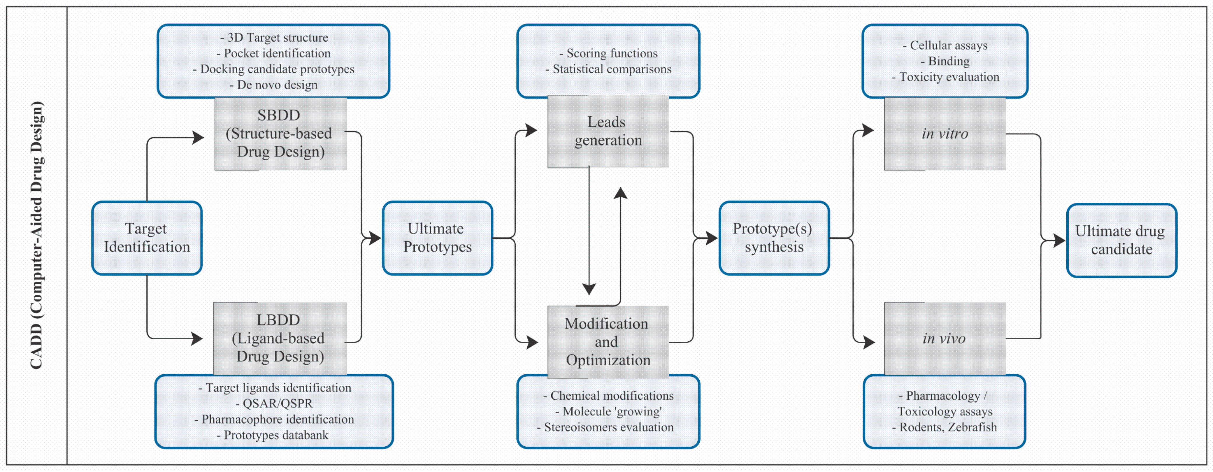 - Mahapatra, M.K.; Karuppasamy, M. Fundamental Considerations in Drug Design. In Computer Aided Drug Design (CADD): From Ligand-Based Methods to Structure-Based Approaches; Elsevier: Amsterdam, The Netherlands, 2022; pp. 17–55. [Google Scholar]