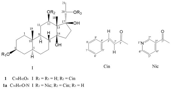 Compound 1a, white amorphous powder. HR-ESIMS (positive-ion mode) m/z for C36H45O7N (em 603.3189): 604.3271 (M + H)+ and 36 carbon signals in the 13C-NMR spectrum indicated that 1a is a mono-nicotinate of 1 (C30H41O6 + C6H4ON) []. The 1H-NMR spectra showed three methyl signals, δH 1.341 (s), 1.122 (d, 6.4 Hz), and 0.908 (s), of steroidal aglycons in the high-field region. Among them, the double-peak methyl signal at of δH 1.122 should be coupled with a proton at δH 3.647 (d, 6.4 Hz), suggesting that the latter should be 20-hydrogen and the 17-carbon is connected with a hydroxyl group, conforming to the characteristics of compound 1. The NMR spectrum of 1a showed characteristics of cinnamyl, such as δH 7.755 and 6.444 (each 1H, dd, J = 15.6, 2.0 Hz, 3′-H and 2′-H), and the 1H-1H correlated spectroscopy (1H-1H COSY) spectrum shows mutual coupling between the two protons. J = 2.0 Hz indicates long-range coupling protons from 5′-H and 9′-H on the benzene ring. Features of a nicotinate moiety also appeared, such as δH 9.202 (1H, s, 2″-H), 8.756 (1H, d, J = 4.8 Hz, 6″-H), 8.293 (1H, dd, J = 8.0, 4.8 Hz, 5″-H), and 7.42–7.37 (4H, m, 4″-H, 6″-H, as well as 7′-H and 8′-H). A proton signal at δH 7.390 identified in COSY and HMBC spectra could be ascribed to 4′-H, as it was coupled with both the signal of 5′-H (δH 8.756) and the δC signals including 150.8 (C-2″), 126.7 (C-3″), 123.3 (C-4″), 137.1 (C-5″), 153.2 (C-6″), and 164.7 (C-7″). Both the 3β-OH and 12β-OH groups are esterified, and the electronegative effect of the ester groups caused the two characteristic protons at δ 4.993 (hept, 4.8 Hz, 3α-H) and 4.692 (dd, 11.6, 4.4 Hz, 12α-H) to shift to the low field. Since the proton signal at δ 4.692 is consistent with that of compound 1, the hepta-peak signal can be assigned to 3α-H. We found that the 21-methyl protons at δ 1.122 not only correlated to the 20-H (doublet at δ 3.647; 1H–1H COSY spectrum) but also to the carbon signals of δC 71.4 and 88.1 (HMBC spectrum), indicating that these two carbons should be assigned as C-20 and C-17, respectively. Therefore, the structure of compound 1a was established as 3β,12β,14β,17β,20(S)-pentahydroxy-5α-pregnan-3β-O-nicotinate-12β-O-(E)-cinnamate (Figure 1). The assignment of 1H- and 13C-NMR data for 1a is shown in Table 1.