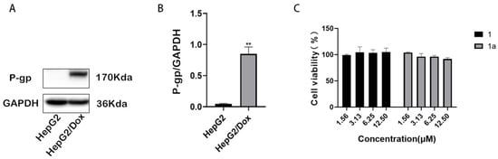 P-gp expression in HepG2 and HepG2/Dox cells. (A) Detection of P-gp by Western blotting. (B) Quantitative analysis of the protein bands. (C) Viability of HepG2/Dox cells after a 48 h treatment with compound 1 or 1a. Compared with HepG2, ** p < 0.01.