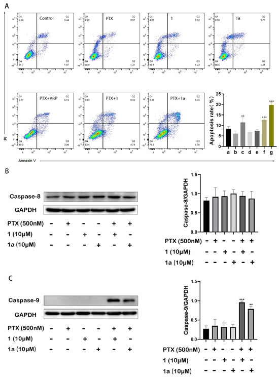 Compounds 1 and 1a significantly enhanced paclitaxel-induced apoptosis in HepG2/Dox cells. Cell apoptosis was recorded using flow cytometry (A), cellular expression levels of caspase 8 (B) and caspase 9 (C) were analyzed via Western blotting. a. Control; b. PTX (500 nM); c. PTX (500 nM) + VRP (10 μM); d. compound 1 (10 μM); e. compound 1a (10 μM); f. PTX (500 nM) + compound 1 (10 μM); g. PTX (500 nM) + compound 1a (10 μM). Compared with PTX alone, ** p < 0.01 and *** p < 0.001.