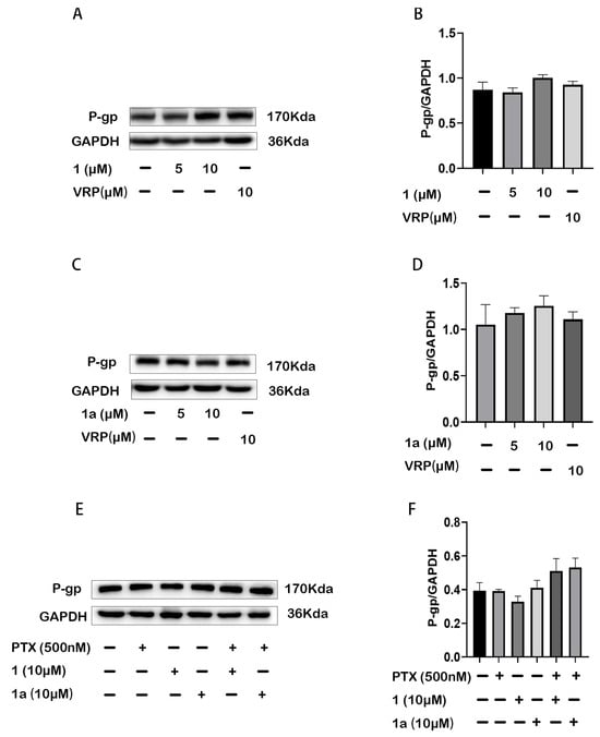 Compound 1 or 1a did not affect P-gp expression in HepG2/Dox cells. (A,C,E) Detection of P-gp expression by Western blotting; (B,D,F) Quantitative analysis of the protein bands.