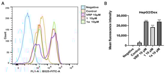 Compounds 1 and 1a significantly inhibited the efflux of Rh-123 from HepG2/Dox cells. (A) Detection of cellular fluorescence using flow cytometry. (B) Quantitative analysis of cellular fluorescence. Negative group: cells without Rh-123; control group: cells incubated with Rh-123 alone. # p < 0.05, compared with negative group; *** p < 0.001, compared with PTX (500 nM) group.