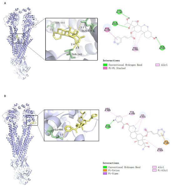 To further reveal the interaction modes of compounds 1 and 1a with P-gp, their molecular docking to P-gp was modeled [] and the results are presented in Figure 6. The results show that compound 1 may interact with P-gp at the GLN-824, THR-240, and SER-993 residues via hydrogen bonding, at the PHE-239 residue via Pi-Pi stacking, and at the PRO-996 residue via hydrophobic interactions, with a calculated binding energy of −8.2 kcal/mol (Figure 6A). Compound 1a may interact with P-gp at the GLU-486 residue via hydrogen bonding, at the ARG-489, TYR-490, LYS-915, and ARG-464 residues via hydrophobic interactions, and at the LYS-380 residue via Pi–cation interactions, with a calculated binding energy of −8.4 kcal/mol (Figure 6B). The results suggest that compounds 1 and 1a may interact with P-gp to form stable complexes, interfere with substrate binding, and thus inhibit P-gp-mediated substrate efflux.
