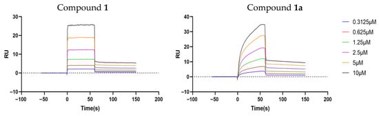 Validation of the above results was performed through surface plasmon resonance (SPR) analyses [,] on the Biacore 8K system. The measured equilibrium dissociation constants (KD), which represent the degree of affinity of the analytes to their target (P-gp; human ABCB1), were as low as 5.53 μM for compound 1 and 3.72 μM for compound 1a, confirming the direct binding between P-glycoprotein and compound 1 or 1a, while the high association rate constant (Ka) (>104 M−1s−1) and dissociation rate constant (Kd) (>10−1 s−1) indicated a fast-binding and fast-dissociating interaction mode (Table 4). In addition, the response–concentration curve of compound 1 supports a hydrogen bond-based interaction with P-gp, while that of compound 1a shows that, despite hydrogen binding, hydrophobic and other interactions also contribute to the binding of compound 1a and P-gp (Figure 7).