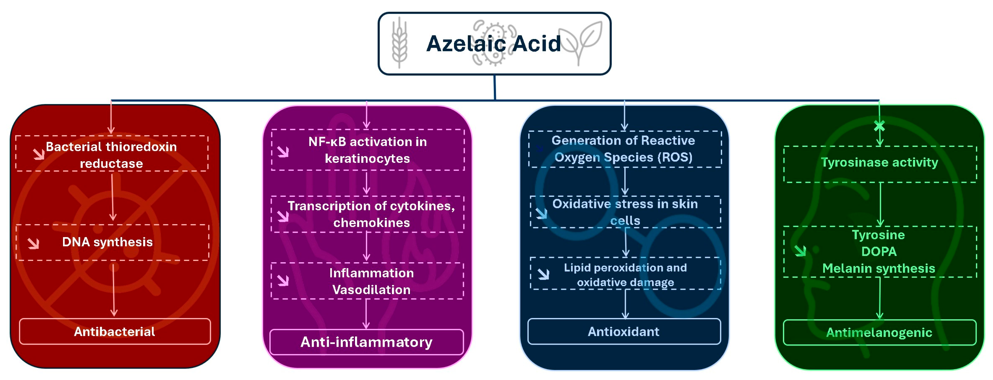 - Feng, X.; Shang, J.; Gu, Z.; Gong, J.; Chen, Y.; Liu, Y. Azelaic acid: Mechanisms of action and clinical applications. Clin. Cosmet. Investig. Dermatol. 2024, 17, 2359–2371. [Google Scholar] [CrossRef]