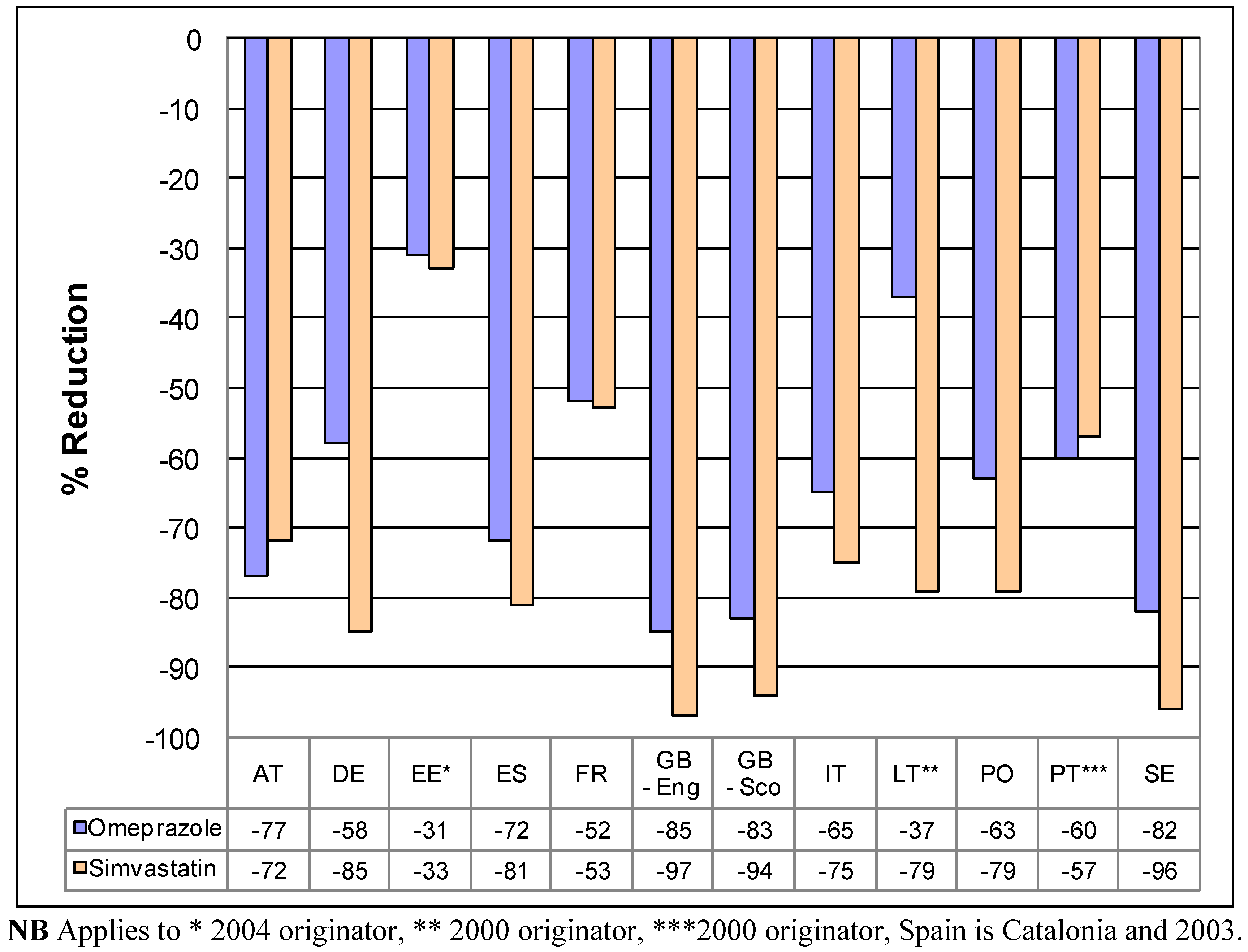 Percentage reduction in reimbursed expenditure for generic omeprazole and generic simvastatin in 2007 vs. 2001originator prices (unless stated) in exemplar countries.