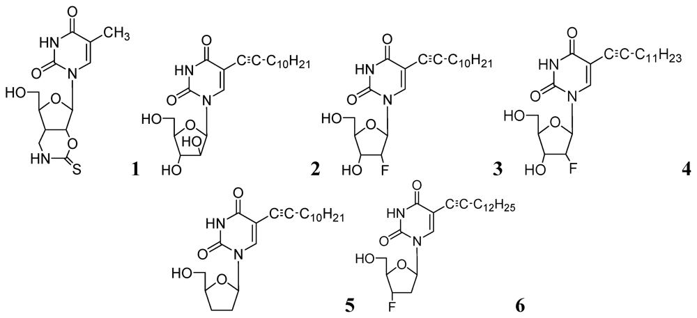 Since our initial report in 2005, we (Kumar and colleagues) have made significant contributions in the investigation of pyrimidine nucleosides as new classes of anti-tuberculosis agents. We designed, synthesized and examined a variety of known and unknown pyrimidine nucleosides substituted/unsubstituted at 2-, 4-, 5- and/or 6- positions of the base, and containing various deoxyribose, ribose, arabinose, dideoxyribose and acyclic sugar moieties. We found that 5-alkynyl substituted pyrimidine nucleosides demonstrated the most potent activity against mycobacteria [52,53]. The MIC90 exhibited by compounds of this series (2, 3 and 4, Figure 2) was in the range of 1–5 μg/mL) against Mtb H37Ra. These compounds were also found to retain sensitivity against an RMP-resistant strain of Mtb H37Rv (American Type Culture Collection [ATCC] 35838, resistant to RMP at 2 μg/mL) at similar concentrations. Subsequently, we reported a series of 5-acetylenic derivatives with 2',3-dideoxyuridine, and 3'-fluoro-2',3'-dideoxyuridine. Compound 5 (among 2',3'-dideoxyuridine series) and compound 6 (among 3'-fluoro-2',3'-dideoxyuridine series) exhibited excellent activity against wild-type Mtb H37Ra (MIC 1–2 μg/mL) and a rifampicin-resistant H37Rv strain (ATCC 35838, resistant to RMP at 2 μg/mL) of Mtb [54] (Figure 2).