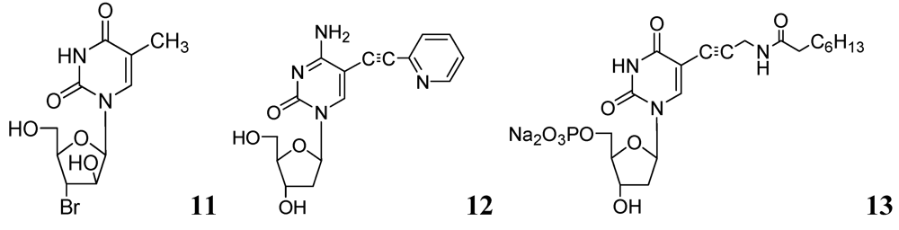 In the same year our group reported antimycobacterial effects of several 5-alkyl- and 5-alkynyl-furanopyrimidines and related 2'-deoxynucleosides. Compounds with 5-arylalkynyl substituents displayed potent in vitro antitubercular activity against M. bovis and Mtb (MIC 0.5–5 μg/mL). We selected compound 12 to test its potency in a mouse model (BALB/c) of Mtb (H37Ra) infection. At a dose of 50 mg/kg for 5 weeks, statistically significant reduction in mycobacterial load was observed in lungs, livers and spleens of the treated mice. This is the first evidence of antimycobacterial potential of 5-substituted pyrimidine nucleosides in an animal model as a potential new class of antituberculosis agents [58].
