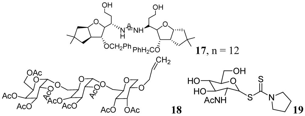 Carbohydrates have been evaluated as antituberculosis agents for a long time. Some selected reports are summarized here. In 2005 bis-glycosylated diamino alcohols were reported by Tripathi et al., where their compound, 17, showed moderate activity against Mtb H37Ra and against Mtb H37Rv. This compound was also active against an MDR strain and showed mild protection in mice at 25 mg/Kg dose [63].