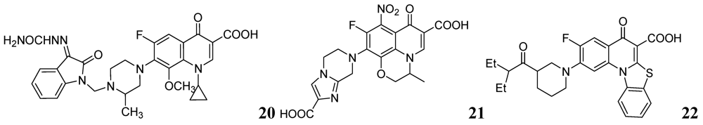Sriram et al. investigated a series of 7-substituted gatifloxacin derivatives. Their compound, 20, was found to be the most active in vitro studies (MIC value 0.0125 μg/mL) against Mtb and MDR-TB. In an animal model 20 decreased the bacterial loads in the lung and spleen by 3.62- and 3.76-log10, respectively [66].