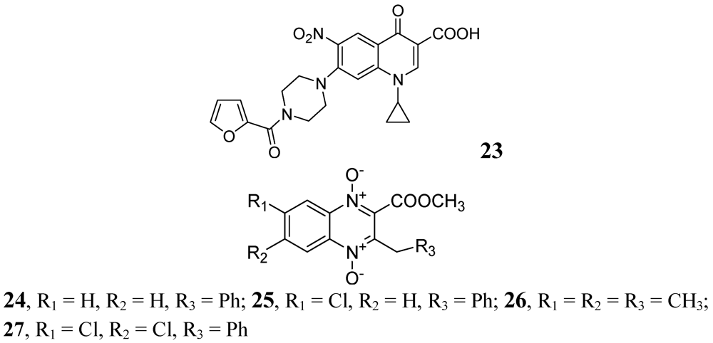 In 2005, Jaso et al. evaluated a series of 6(7)-substituted quinoxaline-2-carboxylate 1,4-dioxide derivatives against MtbH37Rv. Their compounds 24, (MIC 0.1 μg/mL) and 25, (MIC 0.1 μg/mL) had good antituberculosis activity including intracellular bacteria (EC90 0.15 μg/mL and 0.0005 μg/mL, respectively). Compounds 26 and 27 of the series were also active against drug-resistant strains of Mtb H37Rv with MICs of 0.39–1.56 and 3.13–12.5 μg/mL, respectively [70] (Figure 8).
