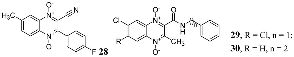 A series of derivatives of 1,4-di-N-oxide-3-phenylquinoxaline was published by Vicente et al. against Mtb H37Rv. Their compound 28 was the most active in the series (MIC < 0.2 μg/mL) [71]. Ancizu et al. also described a series of 1,4-di-N-oxide derivatives of quinoline. Compounds 29 and 30 displayed the most significant inhibition of Mtb H37Rv with MICs < 0.2 μg/mL [72] (Figure 9).