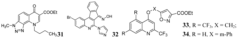 Carta et al. published antituberculosis activity of 3-methyl-9-substituted-6-oxo-6,9-dihydro-3H-[1,2,3]-triazolo[4,5-h]quinolone-carboxylic acids and their esters against wild-type H37Rv and 11 clinically isolated strains of Mtb. The most potent compound in the series was 31 with MIC90 = 0.5 μg/mL [73] (Figure 10).